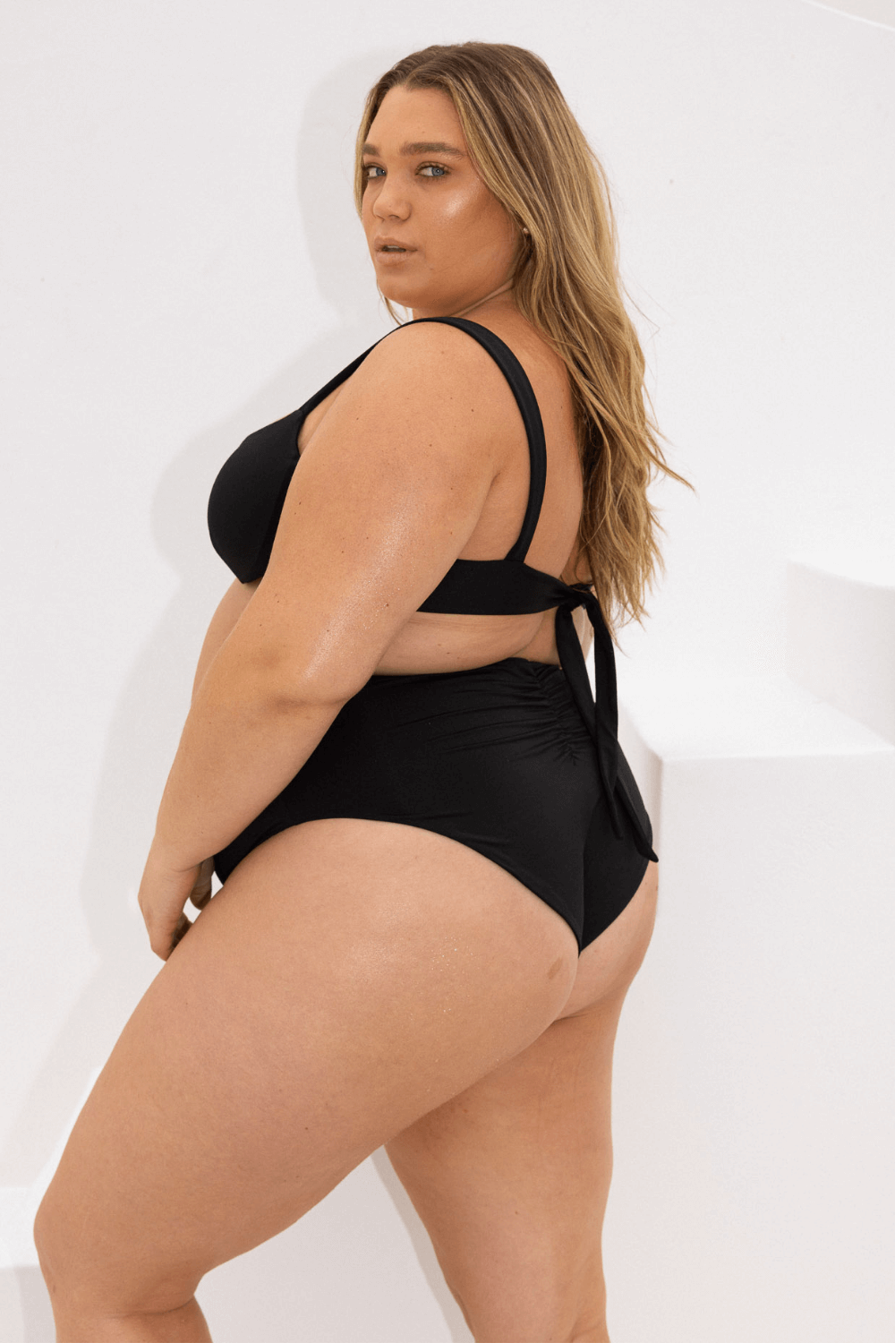 This captivating top pairs well with any of our bottoms, including The High Waisted Scrunch Bottoms for a more coverage style look or The Side Tie Bottoms for a lower coverage fit.